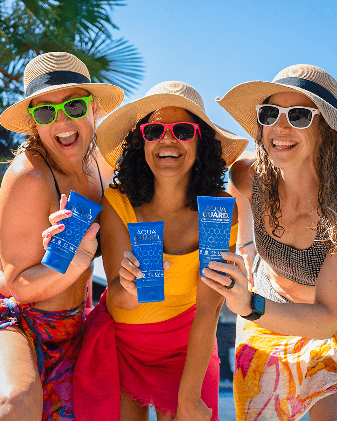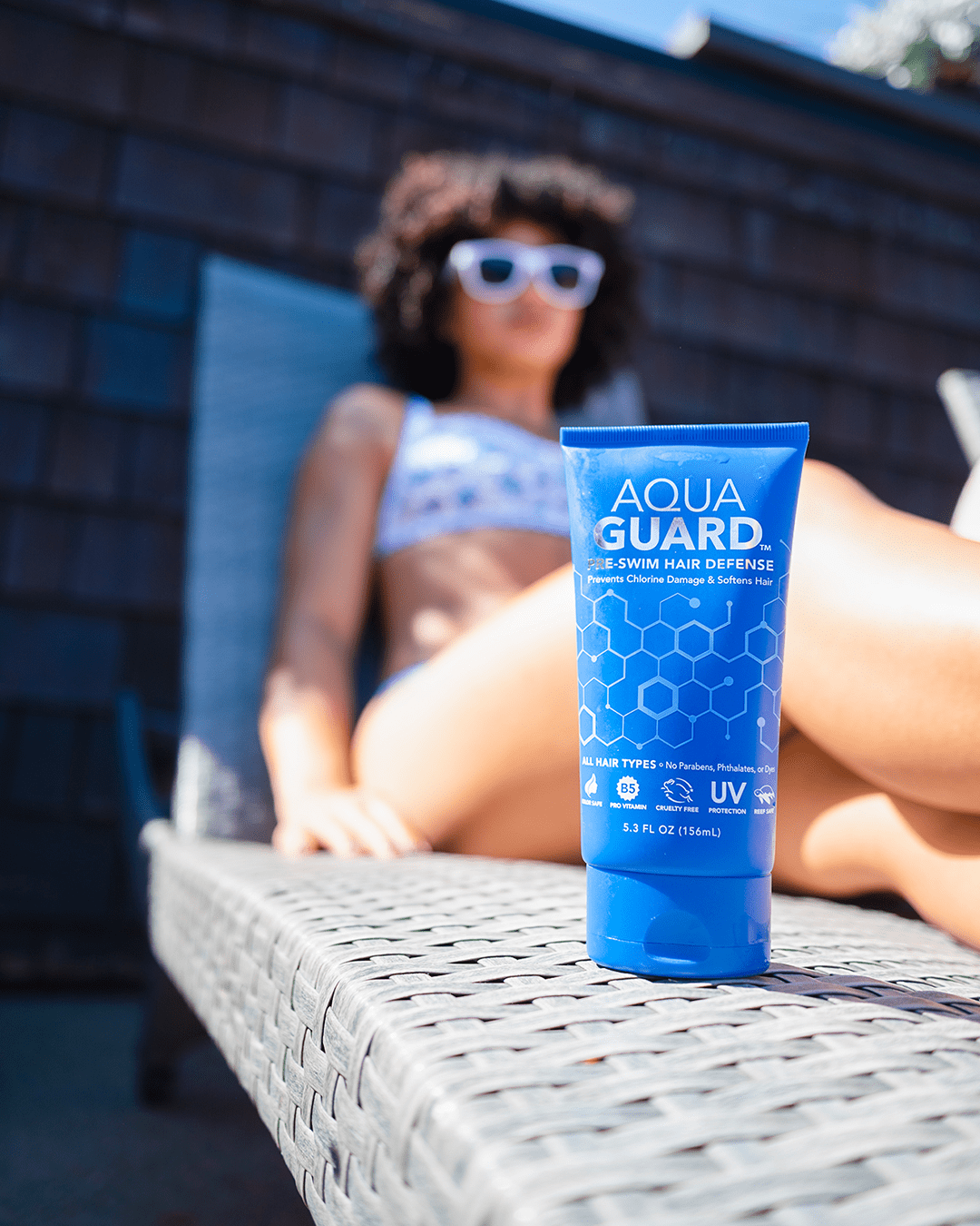 Do you dread dealing with a dry, dull, frizzy mess after the pool? We get it...and that's why we developed AQUA GUARD at our California lab.